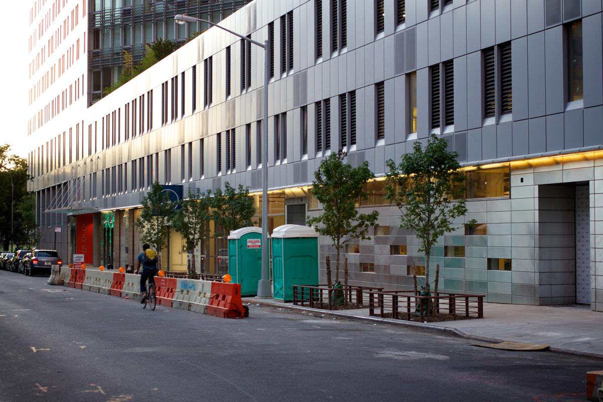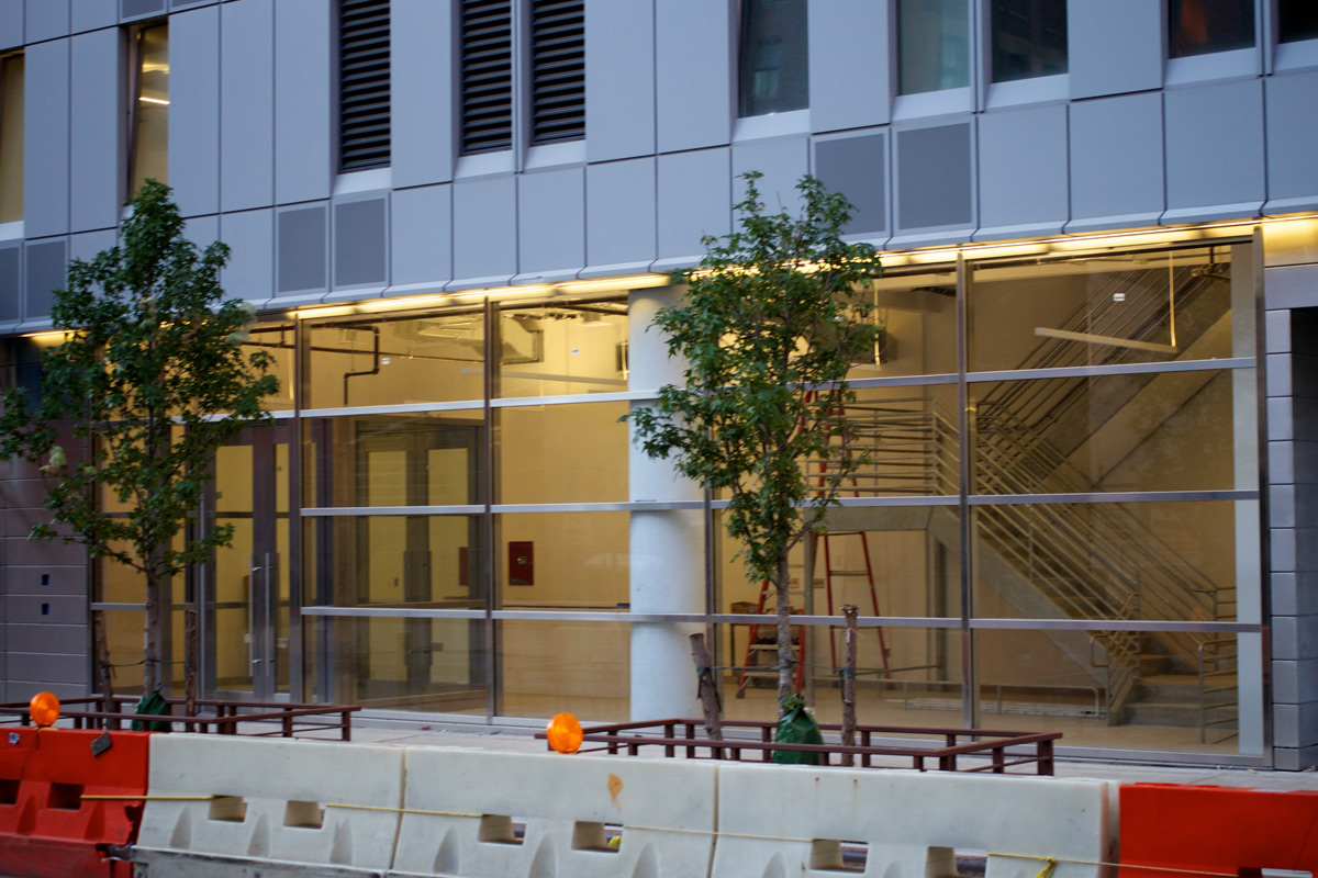 Crews have been making progress on the new NYPD location in the Mercedes House. The new place takes up a wide stretch along W 53rd St, with a very modern exterior: