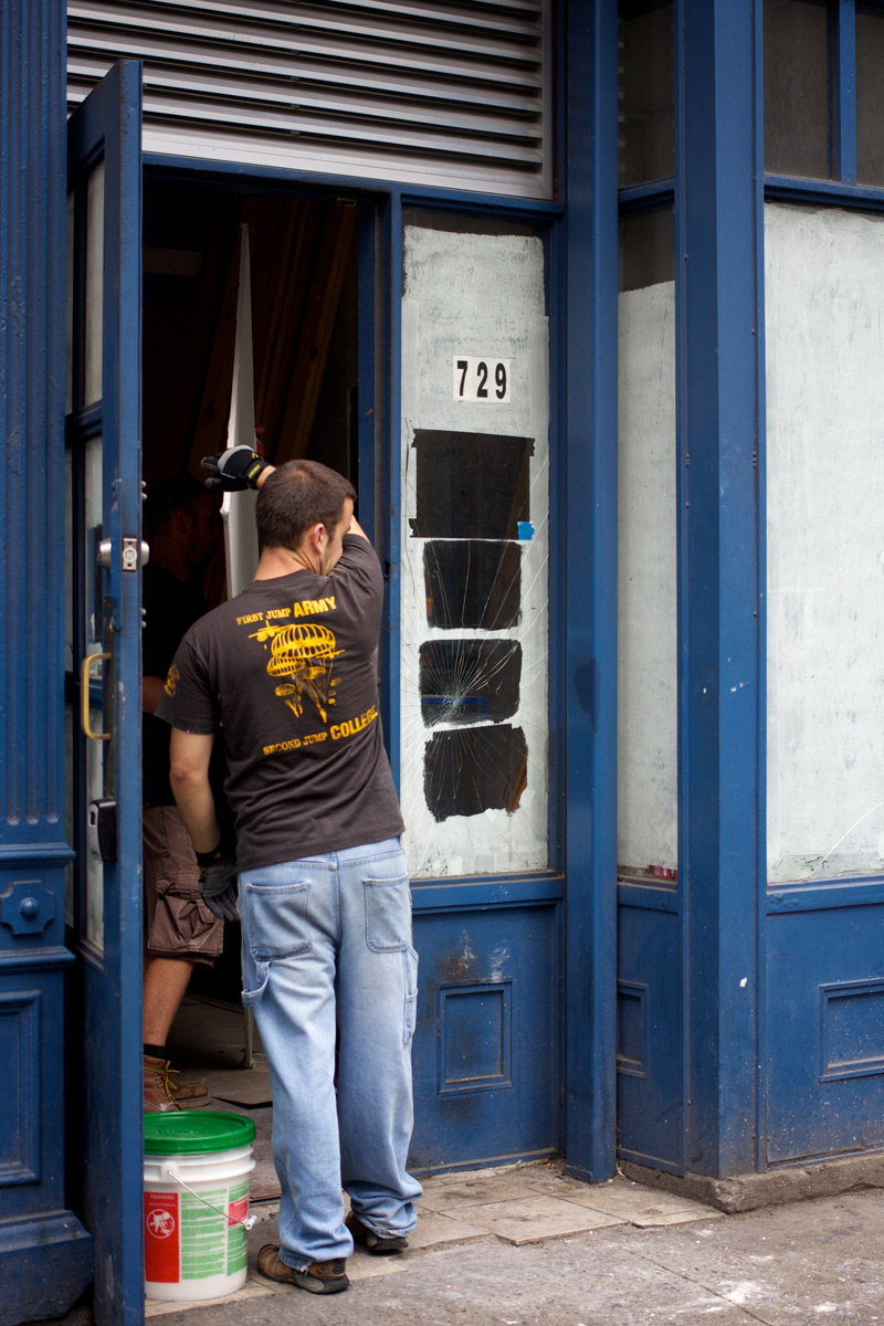 A quick update on the progress of the incoming Pie Face to 8th Ave (previously). Workers were in the store today, setting up the drywall: