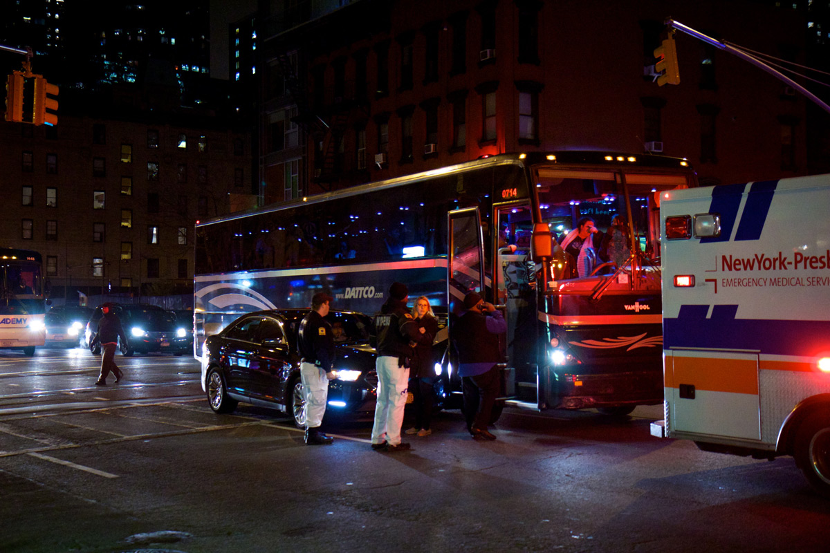 A car and a commercial bus collided this evening around 5:45 at the intersection of W 53rd St & 9th Ave. It looked pretty minor – they were just touching, with no real damage visible – but blocked most of the intersection for at least half an hour. Traffic was great, as you’d imagine.