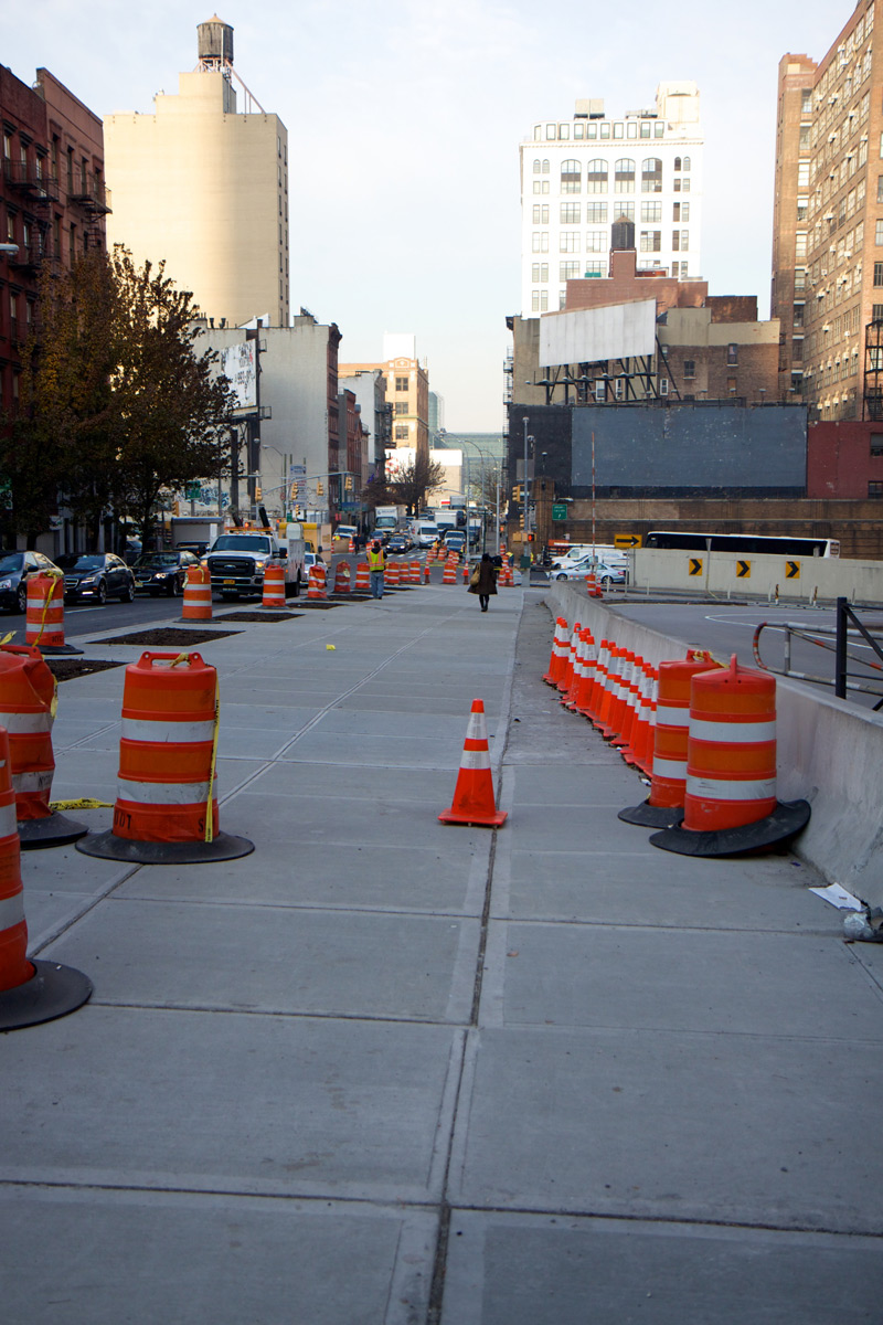 One part of the Chelsea/Hell’s Kitchen Traffic Study (we covered last month) is getting closer to completion. The pedestrian plaza on W 36th St – dubbed the “Canoe Project” – is nearly finished, clearing out what used to be disorganized parking spaces, and the neighboring crossing is ready to go.