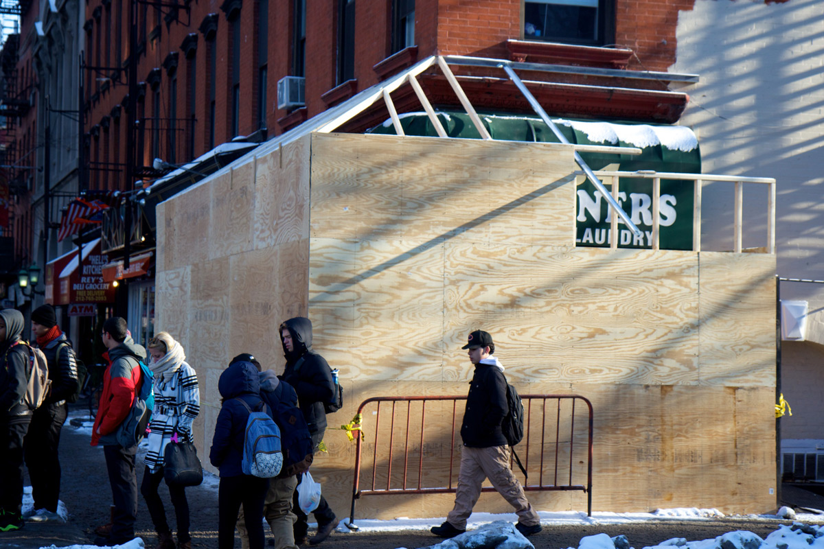 Continuing our non-stop 10th Ave coverage, plywood is going up around the former cleaners on the corner of W 50th St. The spot, which has been for-rent for at least a year now, is finally seeing some life.