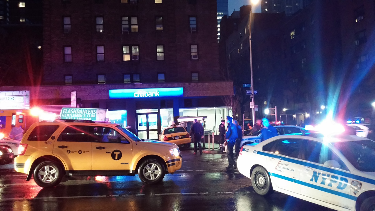 We saw the payphones outside the Citibank at 55th & 9th were damaged during the rain earlier this week, but missed the actual accident. Reader Chris was there just after it happened however, and got took some great photos. The damage after the taxi was cleared made it seem like it was just a relatively minor incident, but turns out it was much more intense: