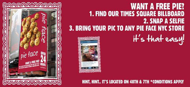 Big news: until January 12th Pie Face are running a promotion where if you take a “selfie” in front of their new billboard on the corner of 48th&7th, you can show that at any of the locations for a free mini savory pie. Go take a picture and try out one of the twolocations that opened in the neighborhood in 2013.