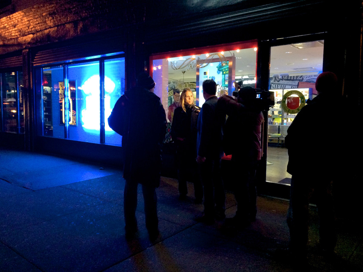 Not really anything to report today, but “real” media couldn’t pass up the opportunity to grab some people for an interview this evening about what they bought for Christmas, outside the bright new Kiehl’s: